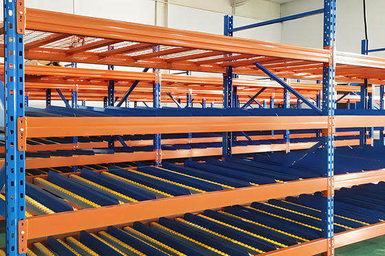 মহাকর্ষীয় র্যাকিং সিস্টেম দুটি প্রধান উপাদান নিয়ে গঠিতঃ একটি স্ট্যাটিক র্যাকিং কাঠামো এবং গতিশীল প্রবাহ রেল।রেলগুলি সাধারণত র্যাকের দৈর্ঘ্য বরাবর একটি হ্রাসে সেট পূর্ণ প্রস্থ রোলার দিয়ে সজ্জিত করা হয়এই রেলগুলি, মহাকর্ষের সাহায্যে, প্যালেটগুলি লোডিংয়ের শেষ থেকে আনলোডিংয়ের শেষ পর্যন্ত চলতে দেয়, গতির গতি লাইন ব্রেক দ্বারা নিয়ন্ত্রিত হয়।এর পিছনে লোডগুলি আনলোডিং পজিশনে এগিয়ে যায়এই পদ্ধতিটি সাধারণত এমন পরিস্থিতিতে ব্যবহৃত হয় যেখানে স্টোরেজ ঘনত্ব এবং স্টক রোটেশন অগ্রাধিকার হয়।এটি একটি উপাদান হ্যান্ডলিং সরঞ্জাম ব্যবহার ছাড়া এক এলাকা থেকে অন্য একটি থেকে প্যালেট সরানোর অনুমতি দেয় যখন একটি প্রথম প্রথম আউট (FIFO) ঘূর্ণন সক্ষম.
